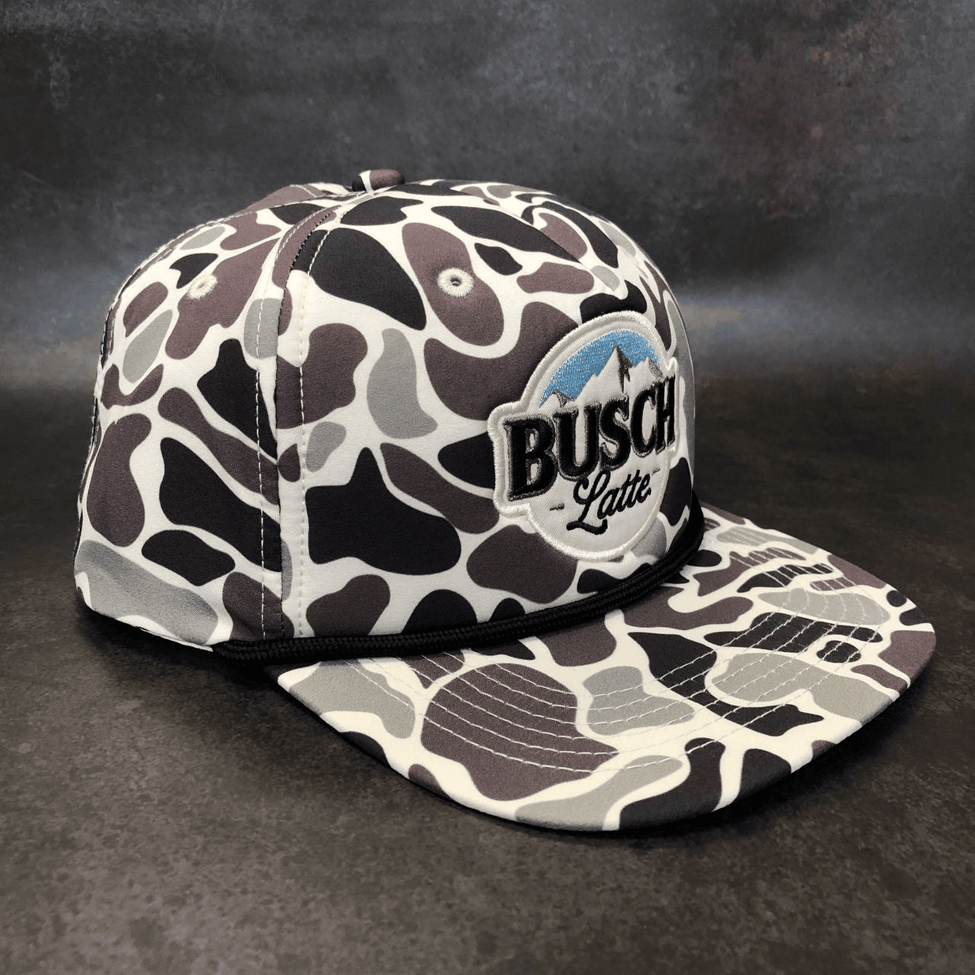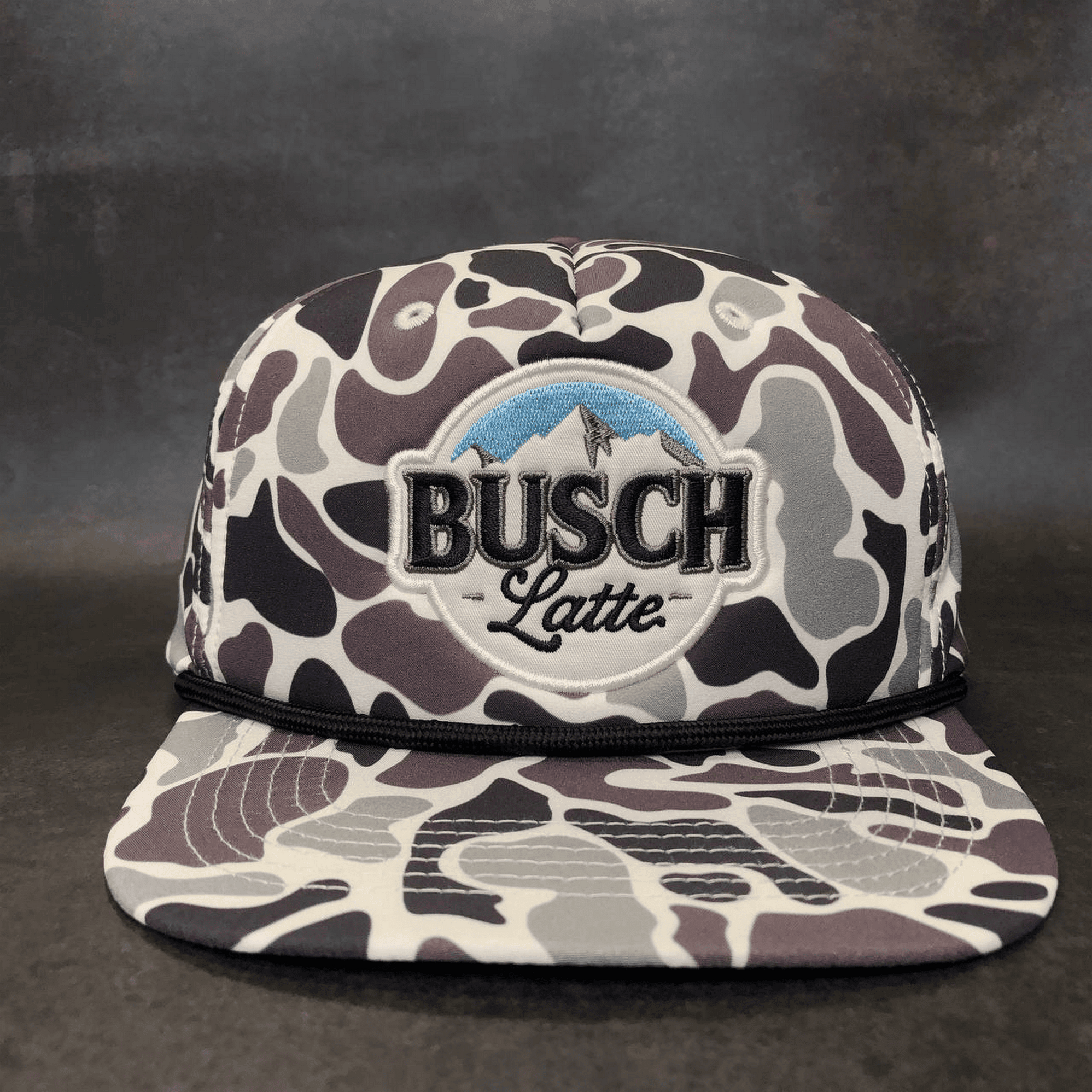 ✅ High-Quality Embroidered Logo – The Busch Latte branding with crisp detailing and a mountain backdrop.
